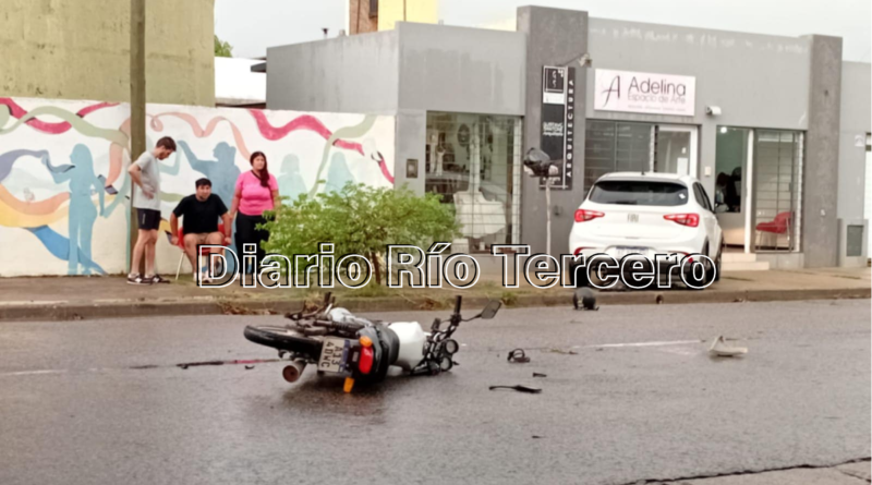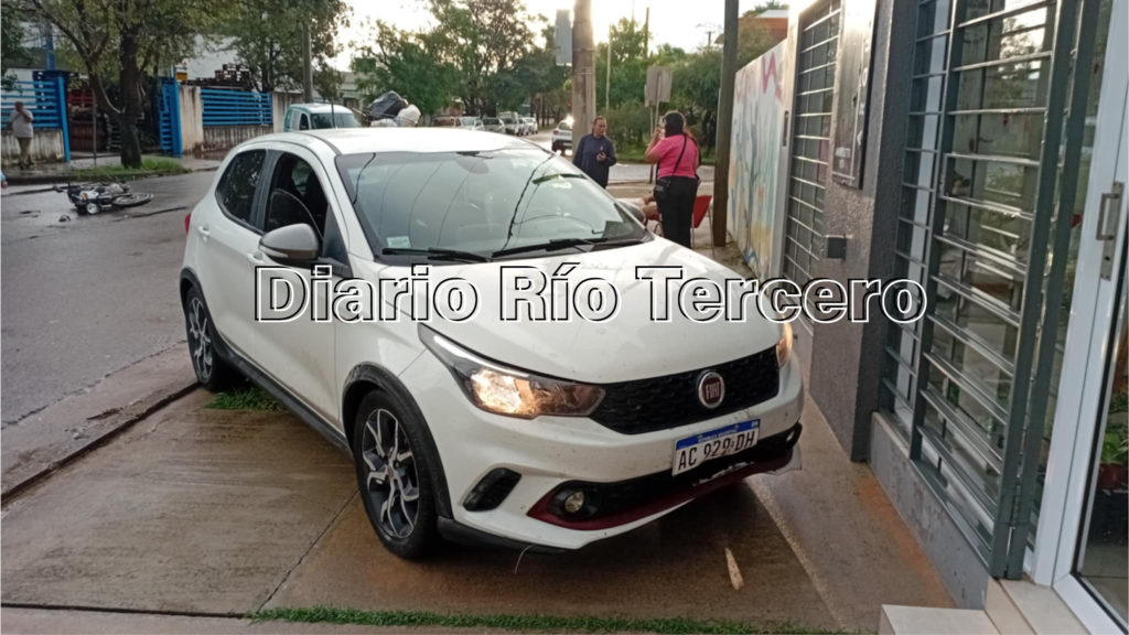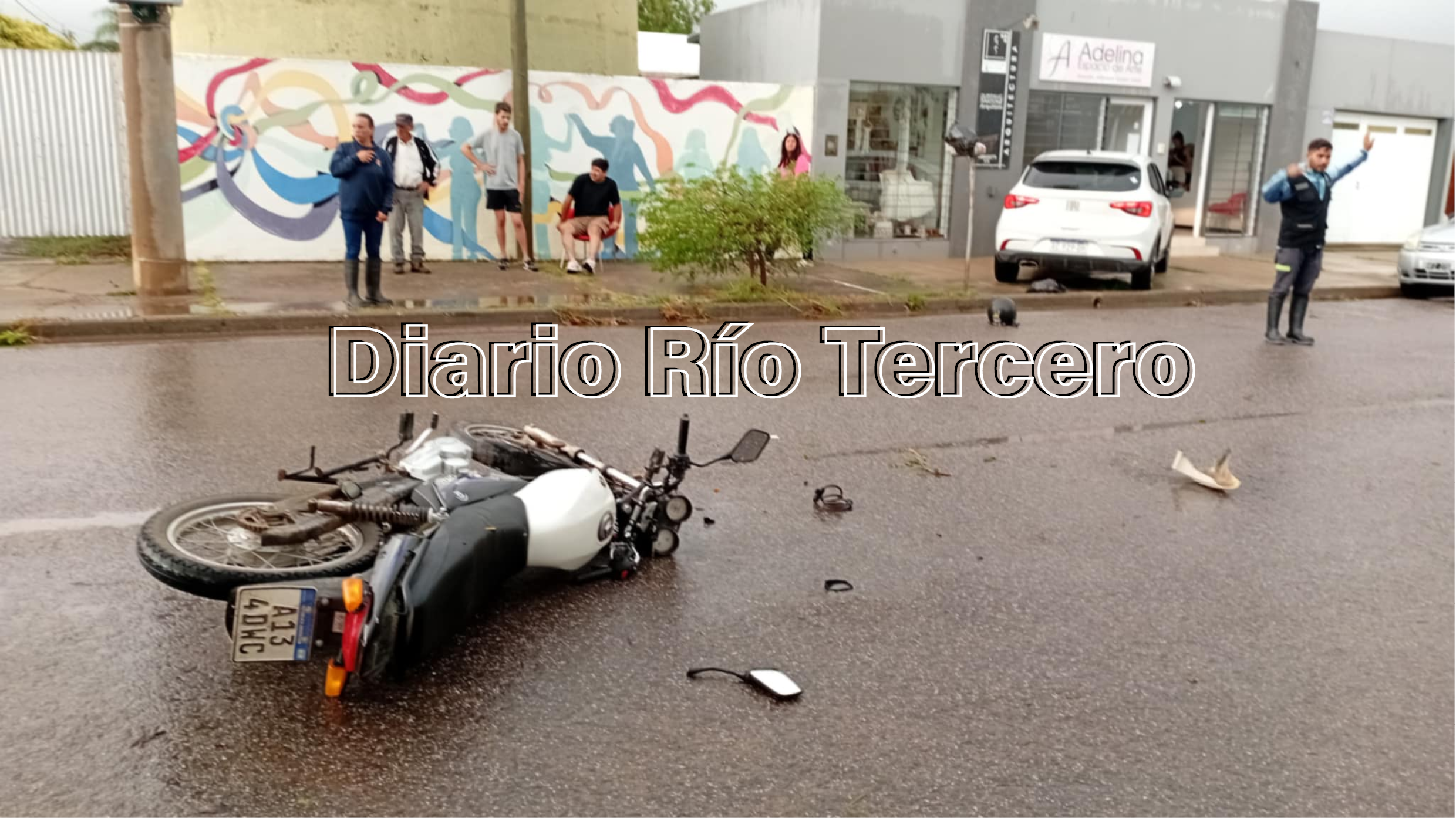 Un siniestro vial entre una moto y un auto se produjo en la esquina de Hilario Cuadros y Ambrosetti de barrio Cabero, apenas pasadas las 19 y cuando había finalizado la fuerte tormenta que se abatió sobre la ciudad.