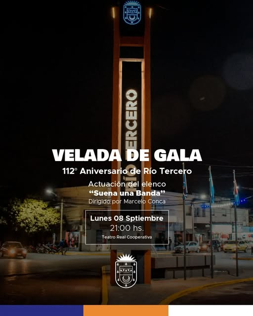 Este martes 9 de septiembre la ciudad de Río Tercero festejará el 112° aniversario de su fundación con actividades artísticas y culturales en el Paseo del Riel. Antes, en la noche de hoy lunes 8, en el Teatro Real Cooperativa, será la velada de gala, a las 21, con un gran espectáculo musical, con entrada libre y gratuita, lo cual se detallará en próximas notas.