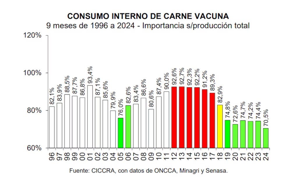 En cuanto al consumo interno total de carne vacuna en los primeros nueve meses del año fue de 1,64 millones de toneladas res con hueso, resultando 11,3% menor al total registrado en el mismo período de 2023.