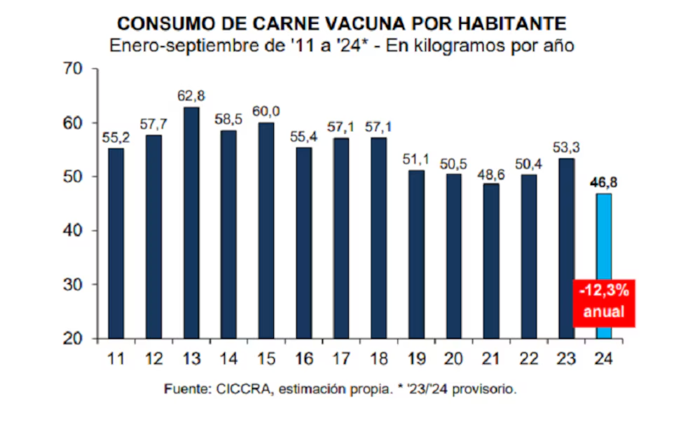 En los primeros nueve meses de 2024, el consumo de carne vacuna per cápita en la Argentina fue equivalente a 46,8 kilos promedio al año, un 12,3% por debajo de igual período de 2023. Ese porcentaje representa una caída de 6,6 kilos por habitante en lo que va de este año.