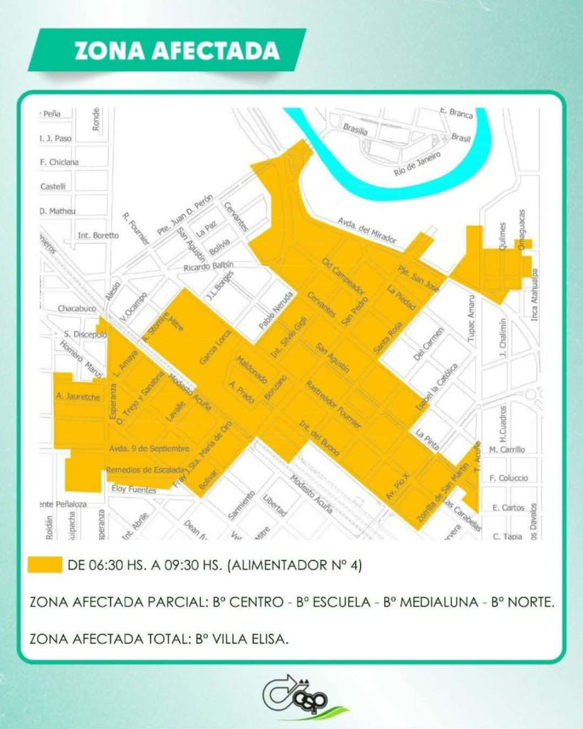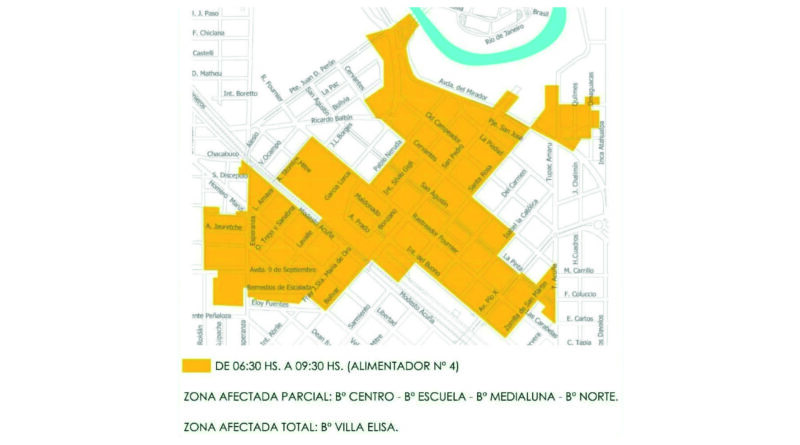 De forma parcial se verán afectados los barrios Centro, Escuela, Media Luna y Norte. De forma total, barrio Villa Elisa.