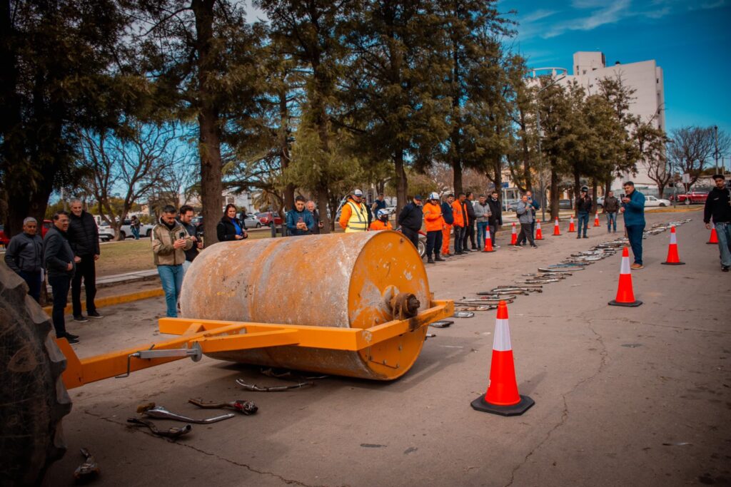 La destrucción se hizo con un rolo apisonador, arrastrado por un tractor, que pasó sobre los 125 caños de escapes ruidosos, libres o adulterados que estaban en línea sobre calle Pasaje Vucetich.