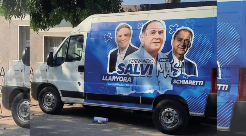 En los laterales del utilitario se pudo ver la imagen de Salvi flanqueado por Martín Llaryora y Juan Schiaretti, con el slogan “Fernando Salvi hace más”.
