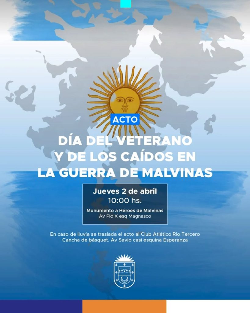 El acto oficial que organiza la Municipalidad de Río Tercero se realizará mañana jueves 2 de abril, a las 10, en el mismo lugar donde esta noche se realizará la vigilia. En caso de mal tiempo el acto se desarrollará en la cancha de básquet del Club Atlético Río Tercero, en Av. General Savio, casi Esperanza.